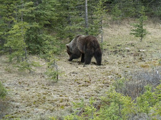We headed up to Jasper National Park a few days later, making lots of stops along the way. The road contains lots of view points and stops (waterfalls, short hikes, amazing lakes). We also saw a good deal of wildlife along the drive, including our first grizzly (1 of 4 bears on the trip). We'd just left the Ranger station off the Trans-Canada highway (cuts through BNP) and a bear ran out in front of the car. By the time I got over the shock, I got out the camera. Unfortunately I only got the hind quarters. We circled back around and reported the bear. Amazingly, the ranger could identify the bear and said they'd seen a lot of activity in the area. This made us a little leery to do any long hikes off in the woods, especially when they had signs suggesting groups of 4 or more. We'd later learned that the suggestion would become mandatory later in the summer.